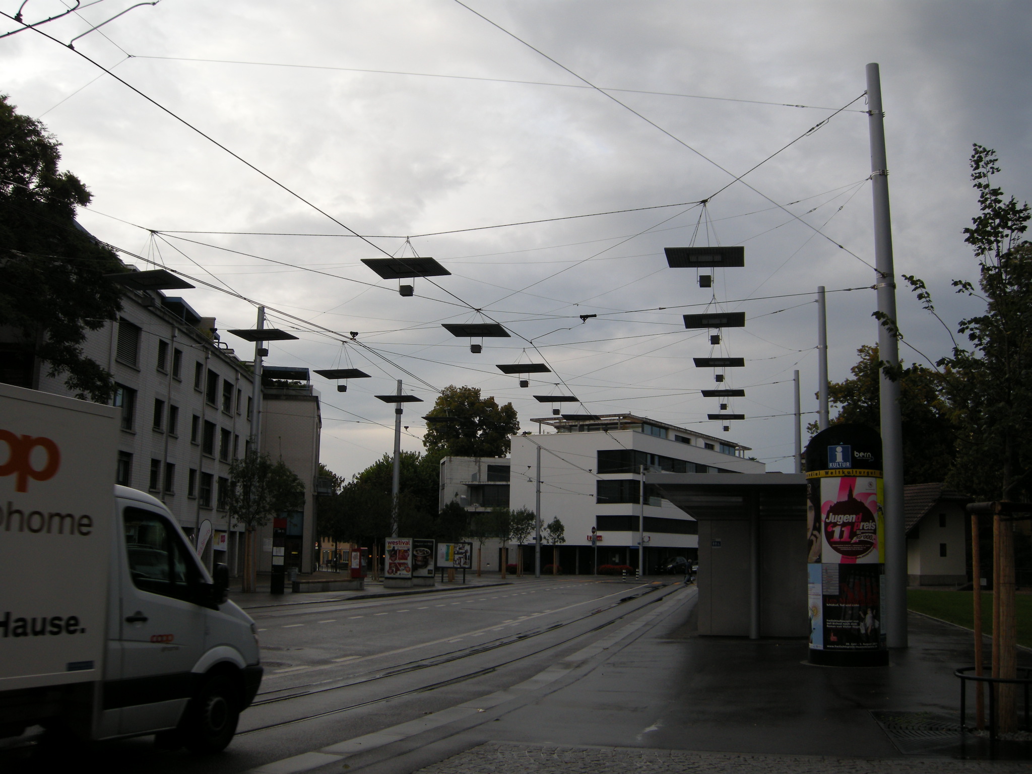 Vezetékre feszített fókuszált világítás az úttestes megállóban: