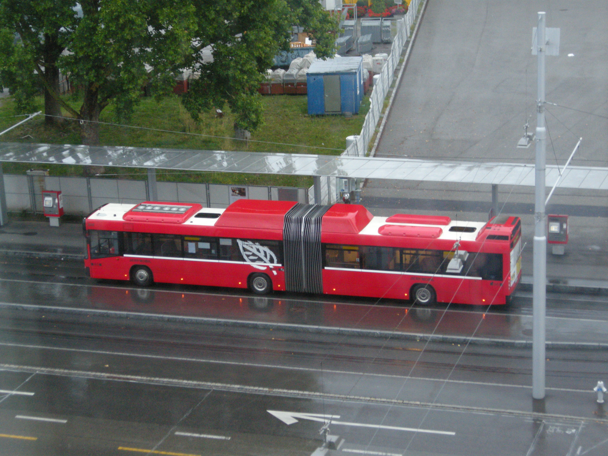 Egy földgáz-üzemű autóbusz. A jármű tetjén középen vannak az üzemanyagtartályok: